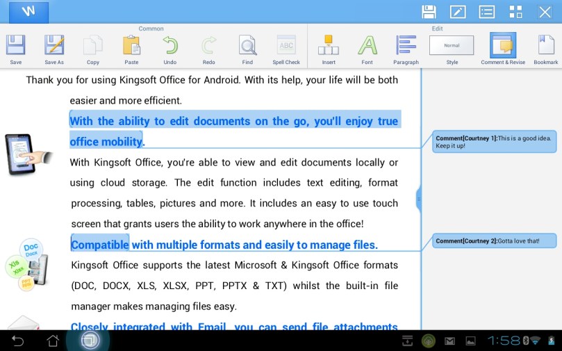 This application has been a game changer for me. My students submit all of their papers electronically into the cloud. From there I download their file onto my computer at home and then provide feedback through margin comments. Until recently, I was unable to do this on my tablet because it doesn’t support Microsoft Word. I tried Splashtop Streamer 2 as a remote desktop to solve this issue (see below) but this is an even easier to use and smoother option.